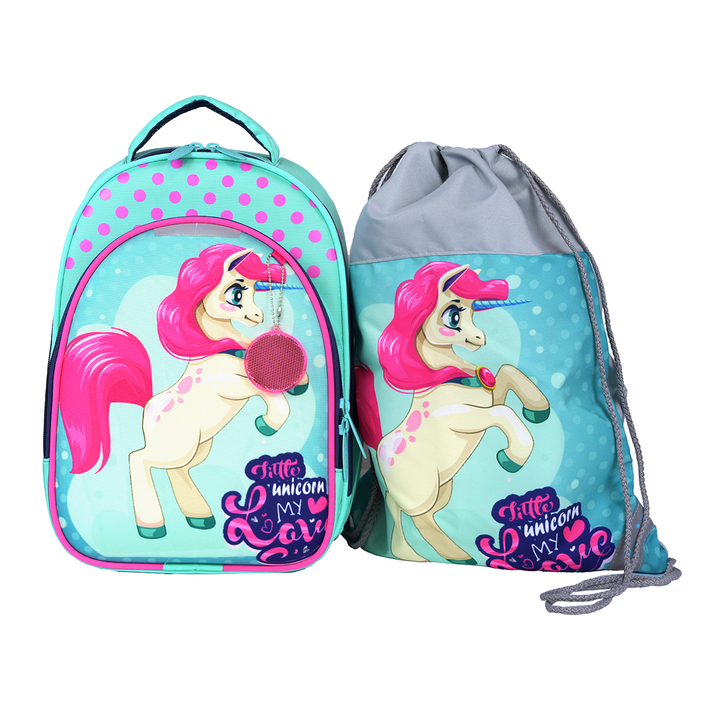 Ранец укомплектован мешком для сменной обуви. В подарок прилагается сувенир-катафот и детская раскраска.