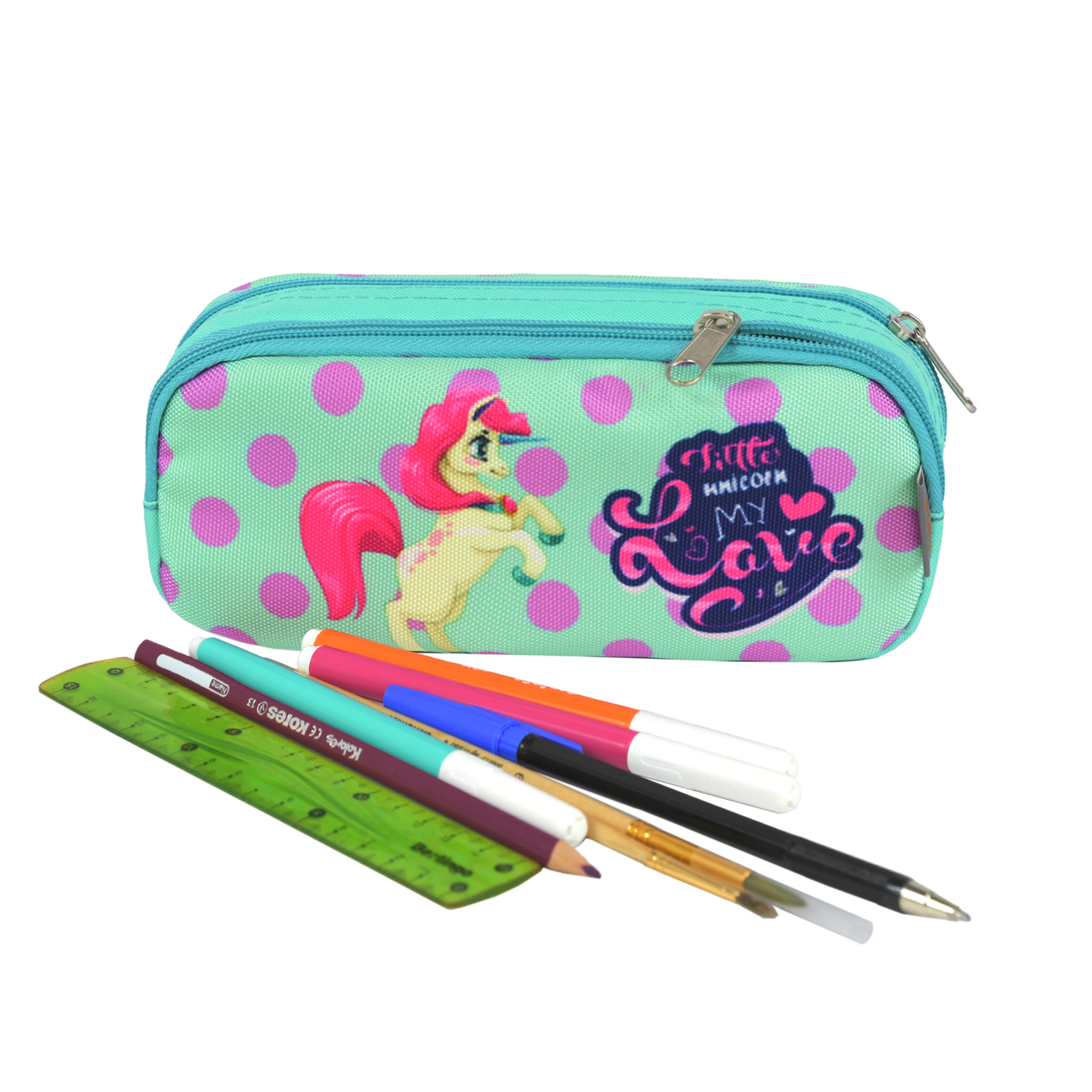 Пенал оформлена ярким принтом, возможно подобрать его в комплект к ранцу и папке с аналогичным принтом.