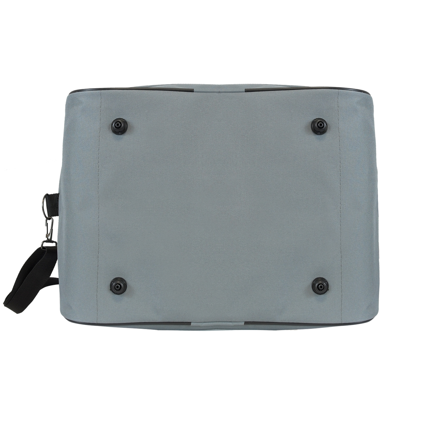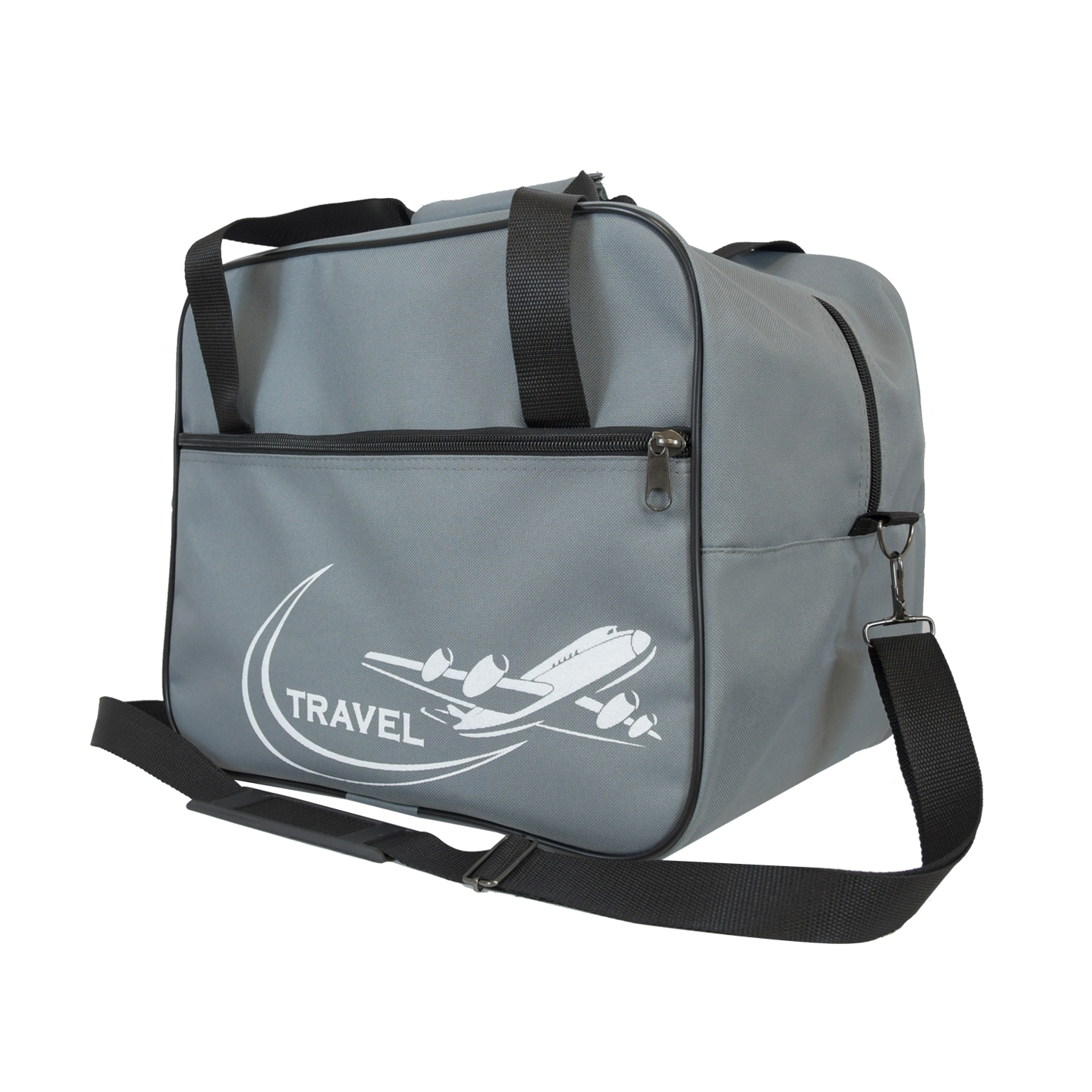 Дорожная сумка предназначена для транспортировки личных вещей, в качестве ручной клади авиакомпании Победа. Изготовлена из прочного водоотталкивающего материала на ПВХ основе. Внутренние швы окантованы. Содержит вместительный основной отдел, на передней стенке один большой карман и карман на задней стенке, используемый также как держатель на выдвижной ручке чемодана. Дно укреплено специальными материалами, установлены четыре пластиковые пукли - ножки. Ручки с текстильным ручкодержателем, уменьшающим давление на ладонь. Фурнитура металлическая. Сумка оснащена длинным съёмным регулируемым ремнем с резиновым наплечником.